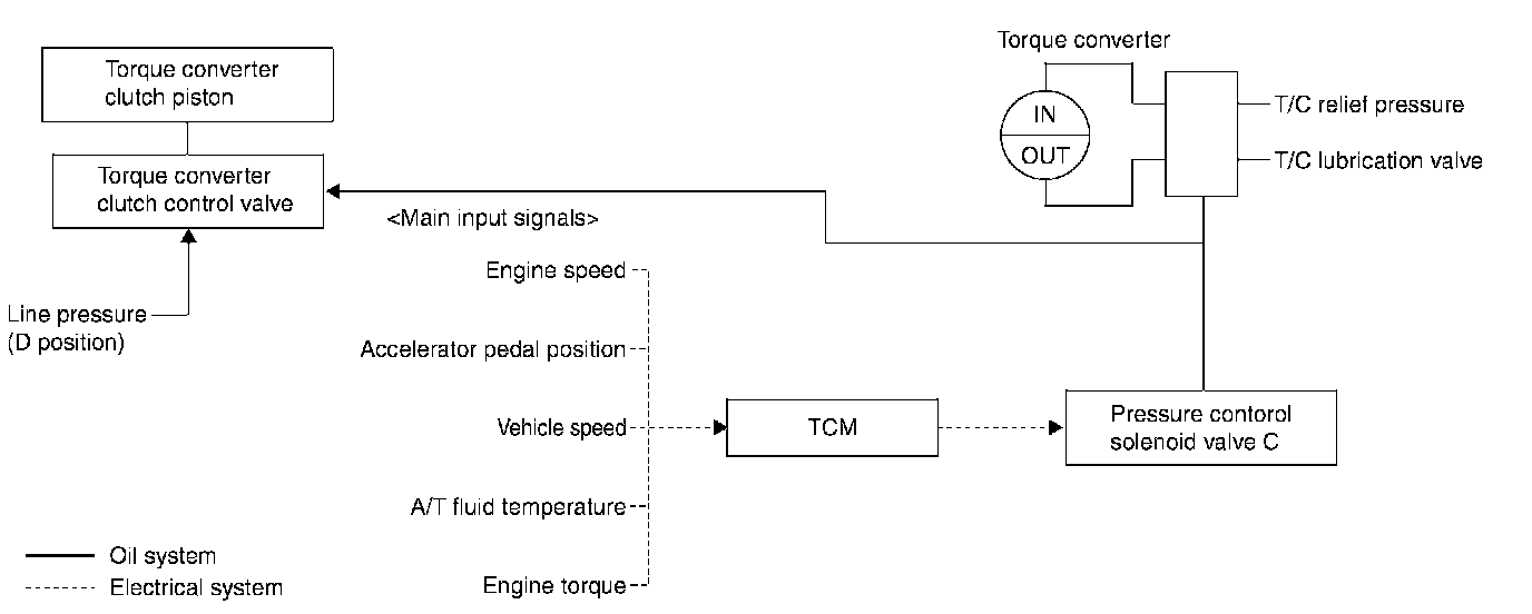 The torque converter clutch control valve operation is controlled by the pressure control solenoid valve C, which is controlled by a signal from TCM, and the torque converter clutch control valve engages or releases the torque converter clutch piston.