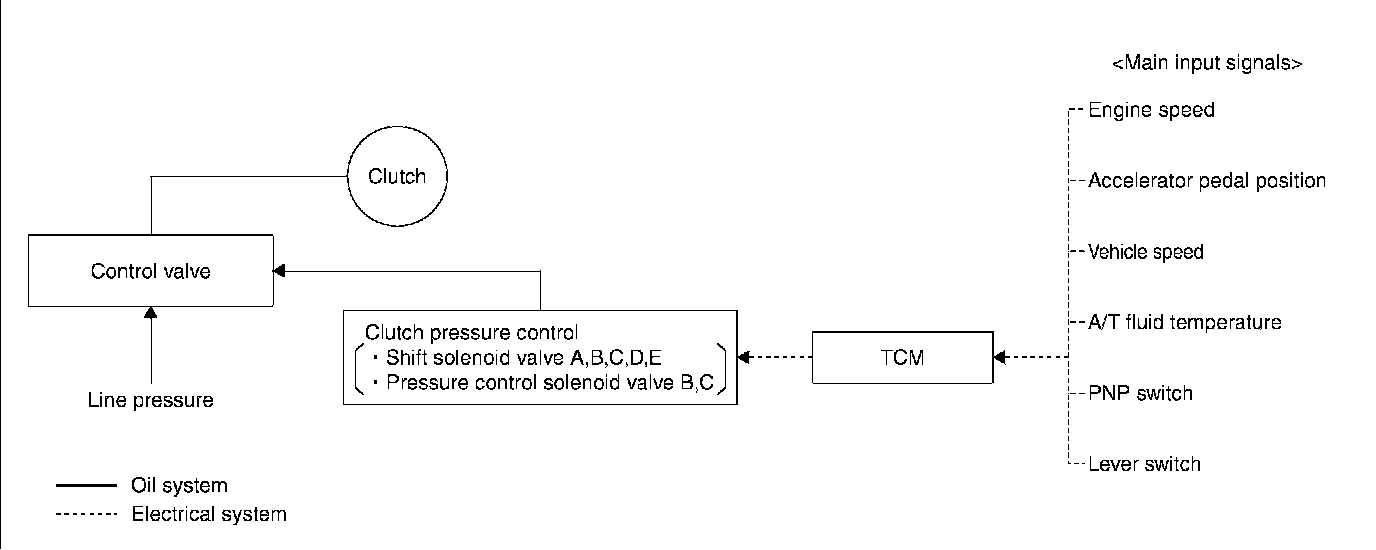 Shift ControlThe clutch pressure control solenoid is controlled by the signals from the switches and sensors. Thus, the clutch pressure is adjusted to be appropriate to the engine load state and vehicle driving state. It becomes possible to finely control the clutch hydraulic pressure with high precision and a smoother shift change characteristic is attained.