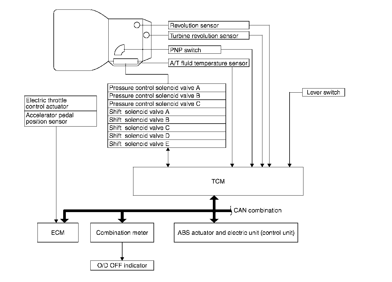 The automatic transaxle senses vehicle operating conditions through various sensors or signals. It always controls the optimum shift position and reduces shifting and lock-us shocks.