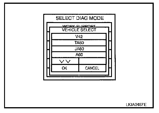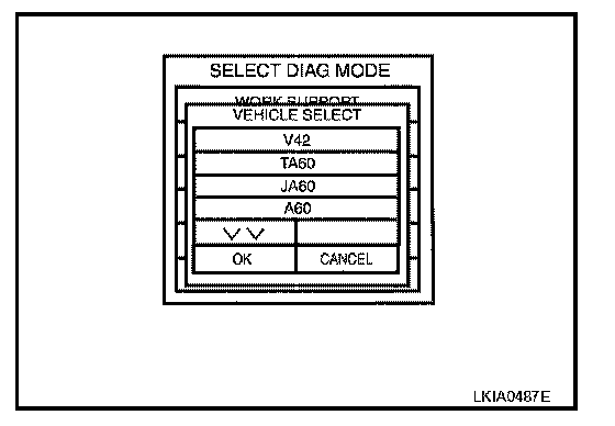6. Touch "V42" and "OK" on "VEHICLE SELECT" screen. For canceling, touch "CANCEL" on "VEHICLE SELECT" screen.