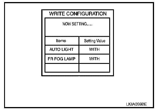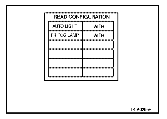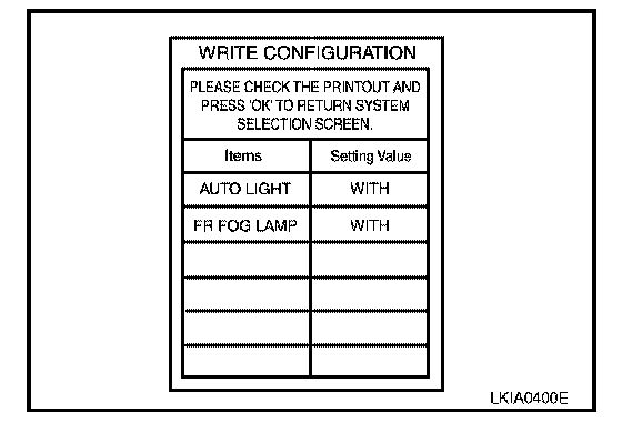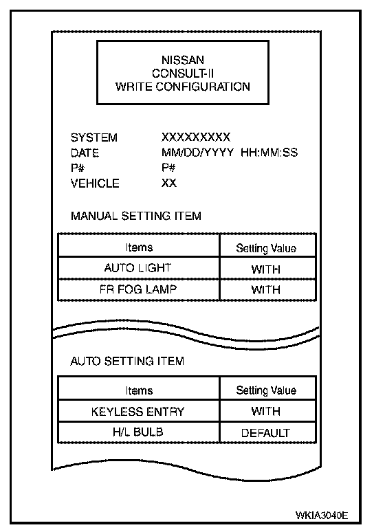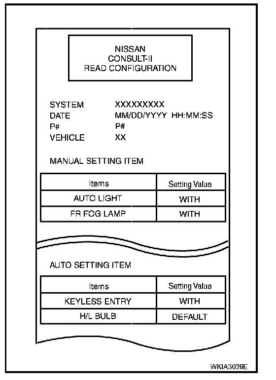 8. Configuration of current BCM is printed out automatically. A listing of manual setting items and auto setting items will be displayed. Auto setting items are preset and cannot be changed. Manual setting items can be set by using WRITE CONFIGURATION PROCEDURE. Refer to "WRITE CONFIGURATION PROCEDURE".