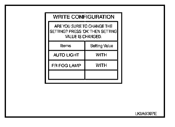 9. Touch "WITH" or "WITHOUT" on "WRITE CONFIGURATION" screen based on the following ITEM LIST.