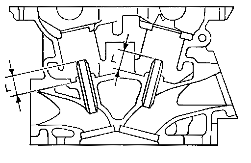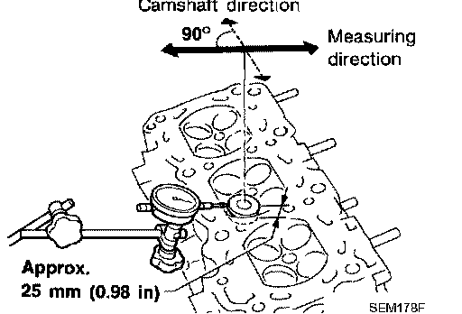 1. Measure valve deflection as shown. (Valve and valve guide mostly wear in this direction.)