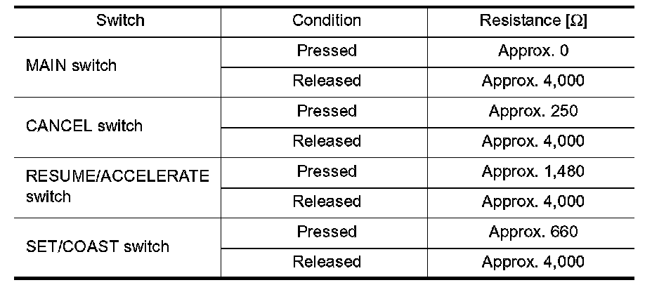 Check continuity between ASCD steering switch terminals 1 and 4 with pushing each switch.