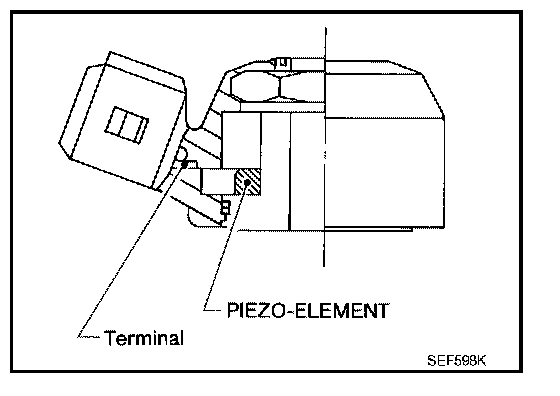 The knock sensor is attached to the cylinder block. It senses engine knocking using a piezoelectric element. A knocking vibration from the cylinder block is sensed as vibrational pressure. This pressure is converted into a voltage signal and sent to the ECM.