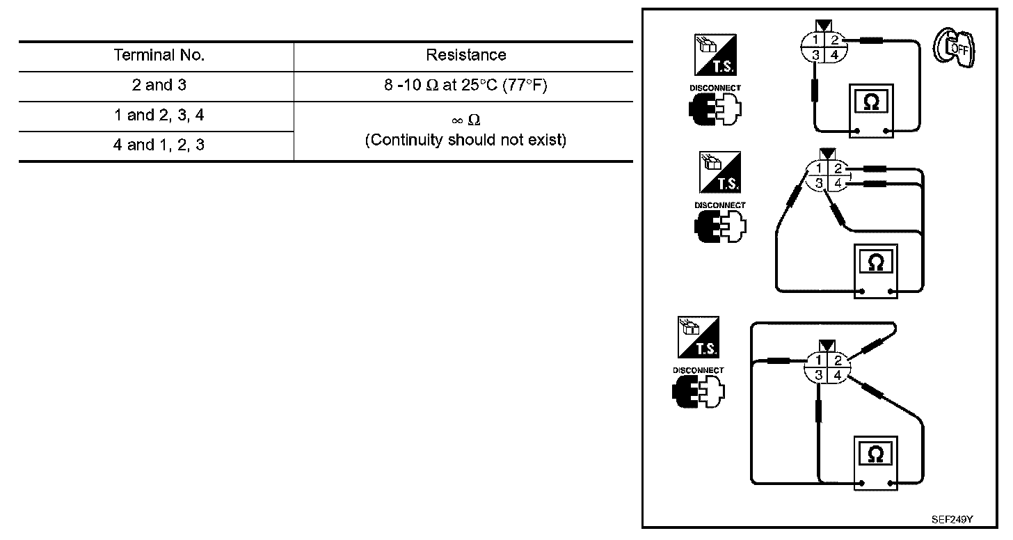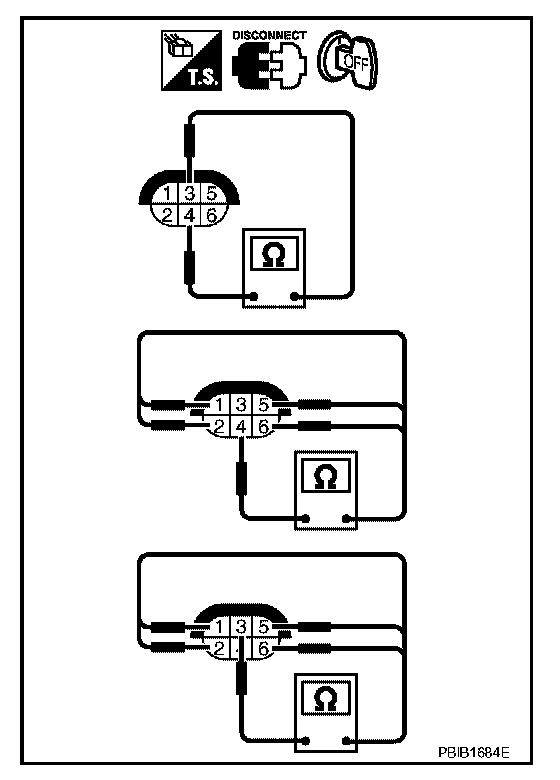 Check continuity between terminals 3 and 1, 2, 5, 6, terminals 4 and 1, 2, 5, 6.