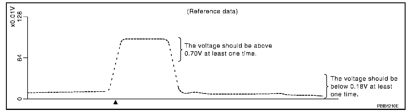 7. Keep vehicle idling for 10 minutes, then check voltage. Or check the voltage when coasting from 80 km/h (50 MPH) in D position with "OD" OFF (A/T), 4th gear position (M/T). The voltage should be below 0.18 V at least once during this procedure.