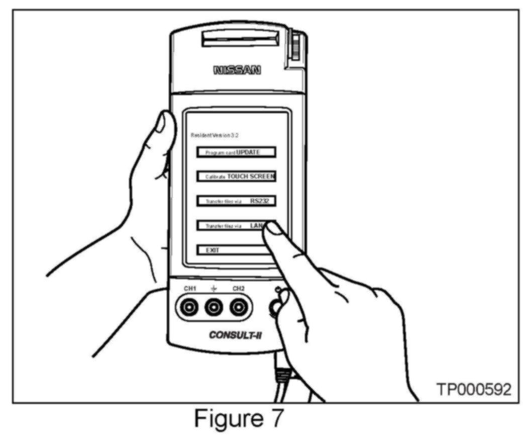 If you accidentally choose a menu option other than "Transfer Files via LAN"; turn CONSULT-II "OFF", and then back "ON" as shown in Figure 6 above.