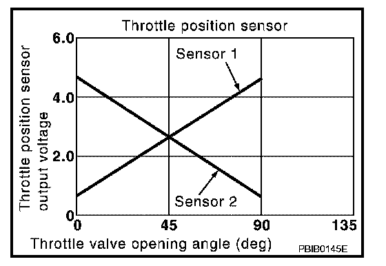 The throttle position sensor has the two sensors. These sensors are a kind of potentiometers which transform the throttle valve position into output voltage, and emit the voltage signal to the ECM. In addition, these sensors detect the opening and closing speed of the throttle valve and feed the voltage signals to the ECM. The ECM judges the current opening angle of the throttle valve from these signals and the ECM controls the throttle control motor to make the throttle valve opening angle properly in response to driving condition.