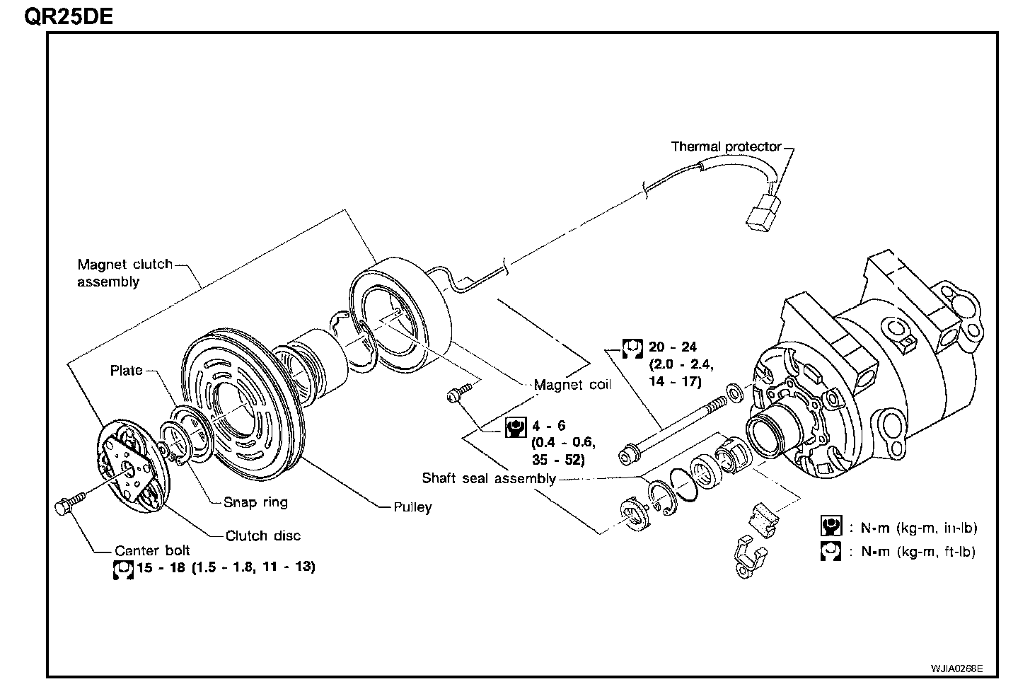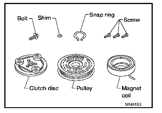 When replacing compressor clutch assembly, always conduct the break-in operation. This is done by engaging and disengaging the clutch about 30 times. Break-in operation raises the level of transmitted torque.