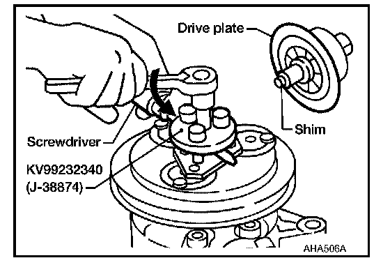 - Install the drive plate on the drive shaft, together with the original shim(s). Press the drive plate down with the installer.