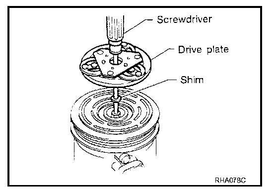 While tightening the center bolt, insert a round bar (screwdriver, etc.) between two of the pins (as shown in the figure) to prevent drive plate rotation. After removing the drive plate, remove the shims from either the drive shaft or the drive plate.
