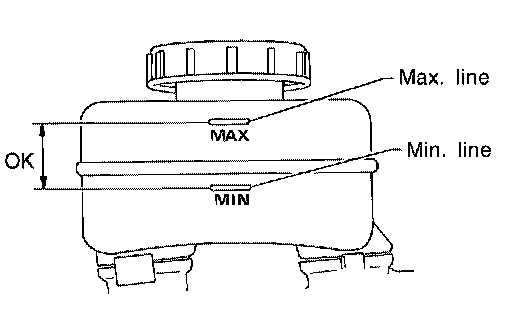 Checking Brake Fluid Level^ Check fluid level in reservoir tank. It should be between the Max and Min lines on reservoir tank.