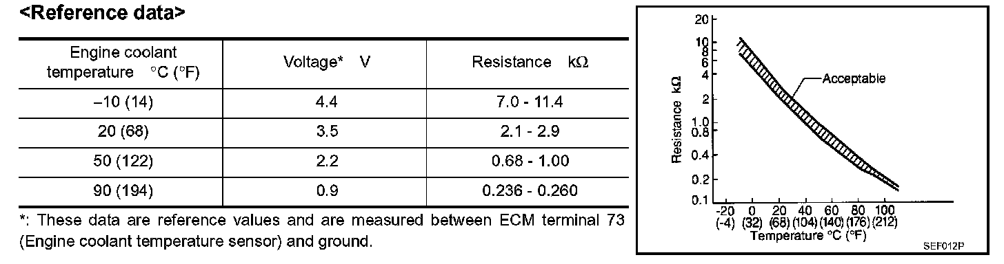 The engine coolant temperature sensor is used to detect the engine coolant temperature. The sensor modifies a voltage signal from the ECM. The modified signal returns to the ECM as the engine coolant temperature input. The sensor uses a thermistor which is sensitive to the change in temperature. The electrical resistance of the thermistor decreases as temperature increases.