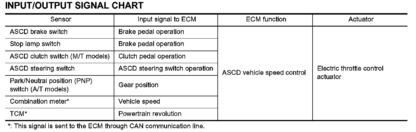ECM controls throttle angle of electric throttle control actuator to regulate engine speed. Operation status of ASCD is indicated by CRUISE indicator and SET indicator in combination meter. If any malfunction occurs in ASCD system, it automatically deactivates the control.