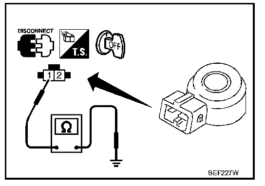 Check resistance between knock sensor terminal 1 and ground.