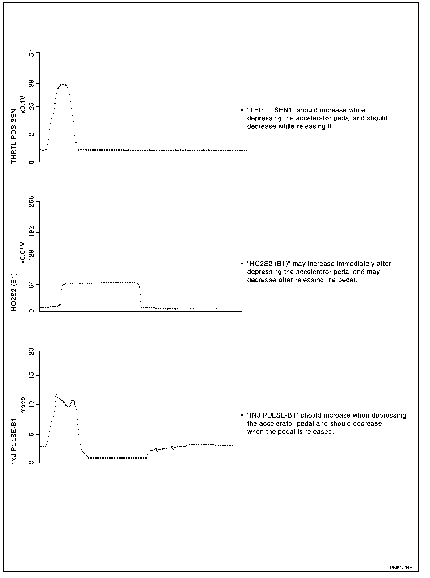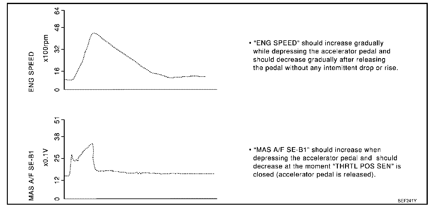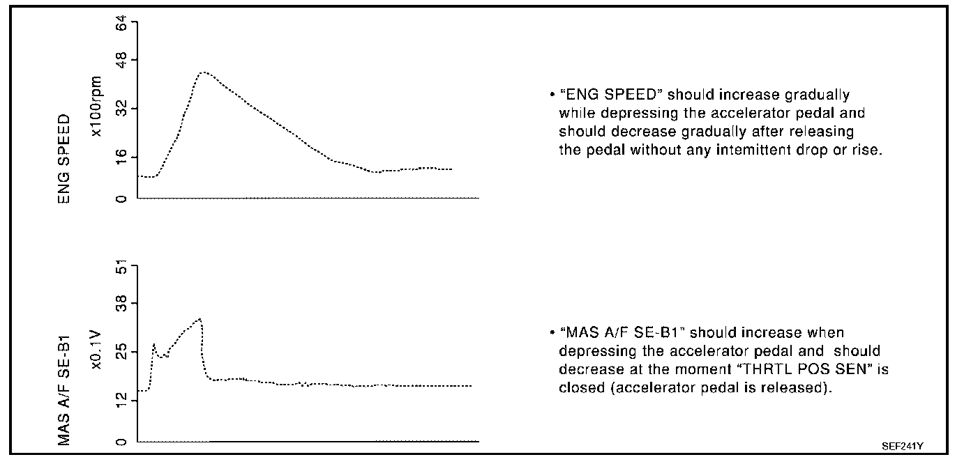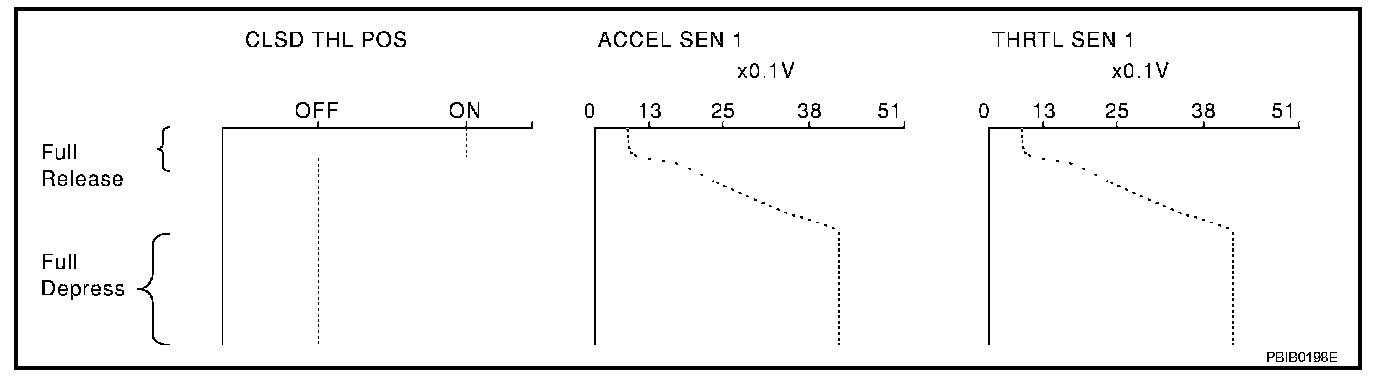 Above is the data for "CLSD THL POS", "ACCEL SEN 1" and "THRTL SEN 1" when depressing the accelerator pedal with the ignition switch ON and with shift lever in D position (A/T), 1st position (M/T).
