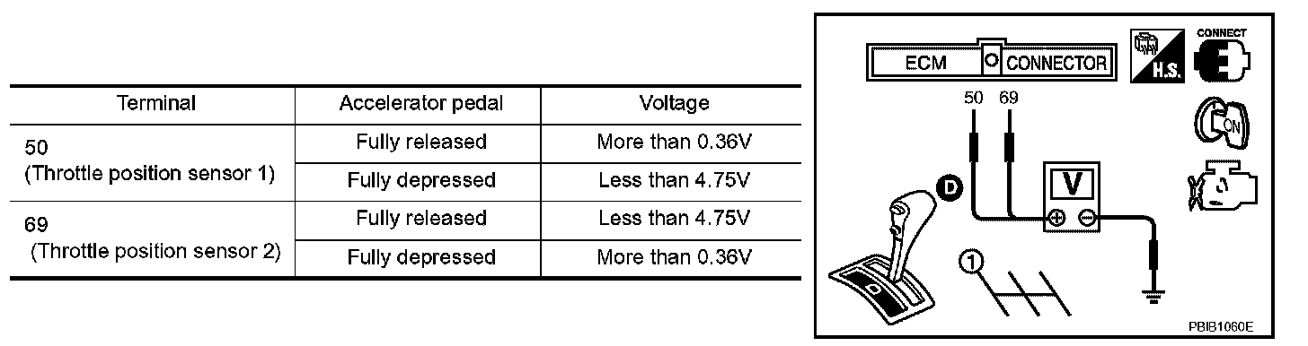 5. Check voltage between ECM terminals 50 (TP sensor 1), 69 (TP sensor 2) and ground under the given conditions.