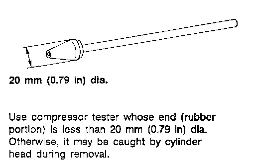 ^ Use compression gauge whose picking up end inserted to spark plug hole is smaller than 20 mm (0.79 inch) in diameter. Otherwise, it may be caught by cylinder head during removal.