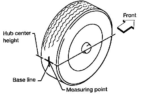 3. Put a mark on base line of the tread (rear side) of both front tires at the same height as hub center as shown. These marks are measuring points.