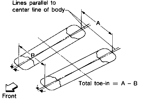 6. Measure the distance B on the front side of the front tires at the same marks as shown. Total toe-in is calculated as A - B.