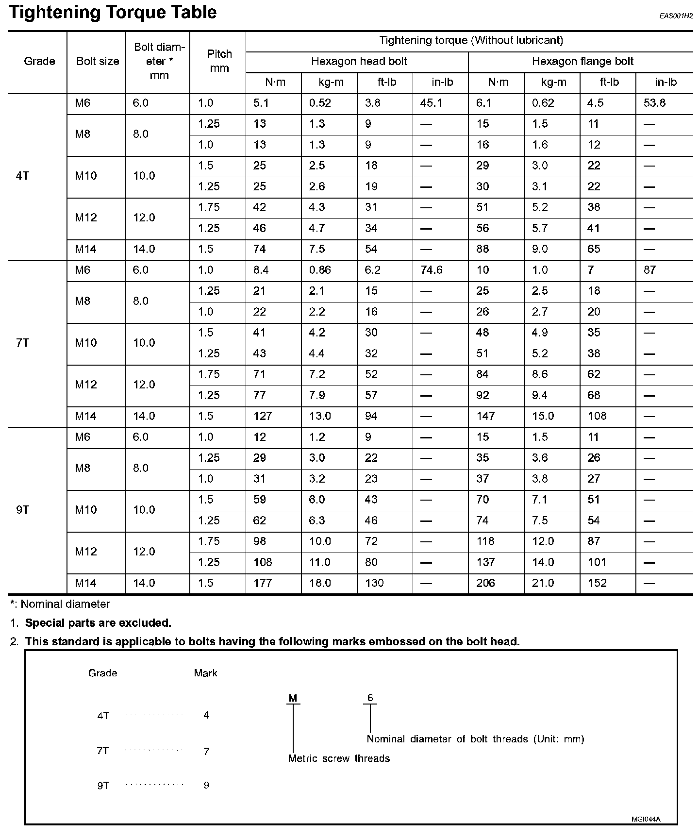 Tightening Torque Of Standard Bolts: