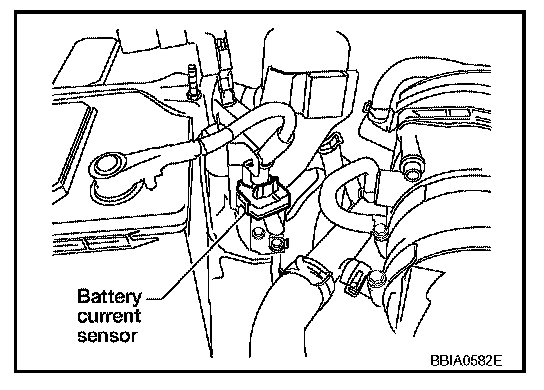 The power generation voltage variable control enables fuel consumption to be decreased by reducing the engine load which is caused by the power generation of the generator. The battery current sensor is installed to the battery cable at the negative terminal. The sensor measures the charging/discharging current of the battery. Based on the sensor signal, ECM judges whether or not the power generation voltage variable control is performed. When performing the power generation voltage variable control, ECM calculates the target power generation voltage based on the sensor signal. And ECM sends the calculated value as the power generation command value to IPDM E/R. For the details of the power generation voltage variable control, refer to Starting and Charging.
