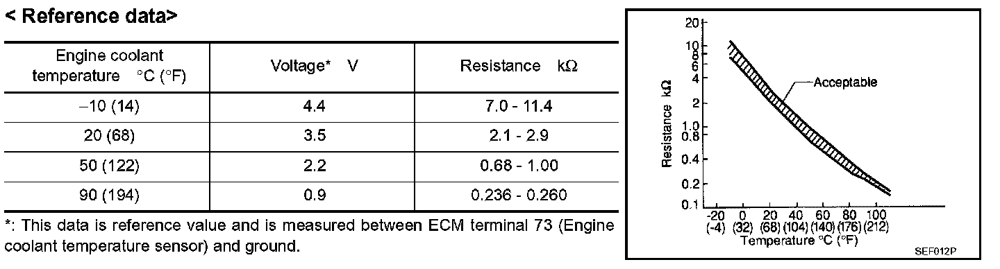 The engine coolant temperature sensor is used to detect the engine coolant temperature. The sensor modifies a voltage signal from the ECM. The modified signal returns to the ECM as the engine coolant temperature input. The sensor uses a thermistor which is sensitive to the change in temperature. The electrical resistance of the thermistor decreases as temperature increases.