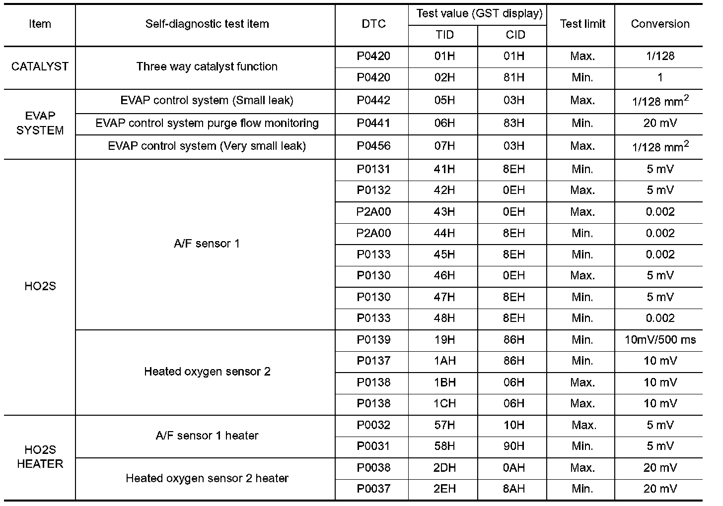 The test value is a parameter used to determine whether a system/circuit diagnostic test is "OK" or "NG" while being monitored by the ECM during self-diagnosis. The test limit is a reference value which is specified as the maximum or minimum value and is compared with the test value being monitored.