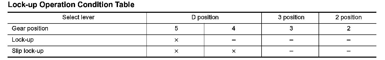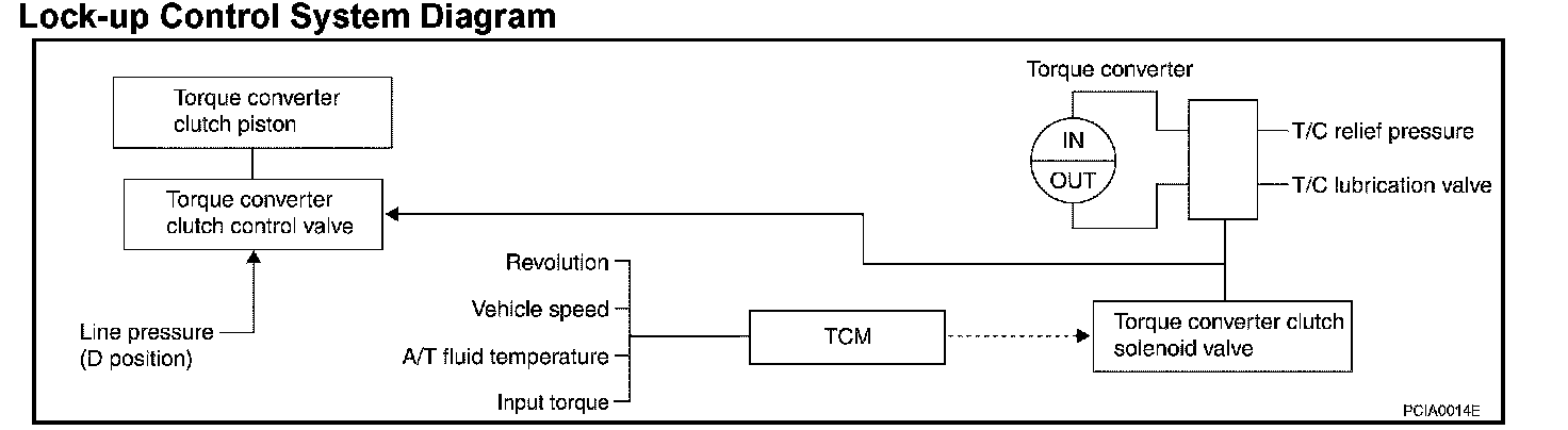 Lock-up ControlThe torque converter clutch piston in the torque converter is engaged to eliminate torque converter slip to increase power transmission efficiency. The torque converter clutch control valve operation is controlled by the torque converter clutch solenoid valve, which is controlled by a signal from TCM, and the torque converter clutch control valve engages or releases the torque converter clutch piston.
