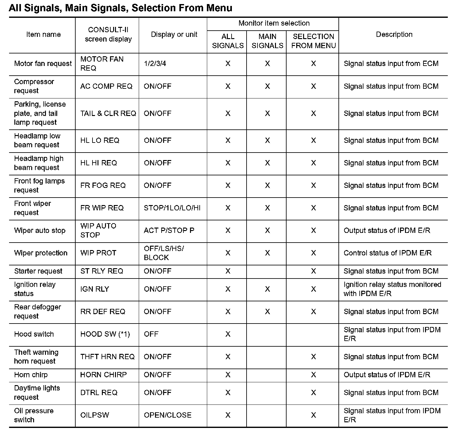 - Perform monitoring of IPDM E/R data with the ignition switch ON. When the ignition switch is in ACC position, display may not be correct.