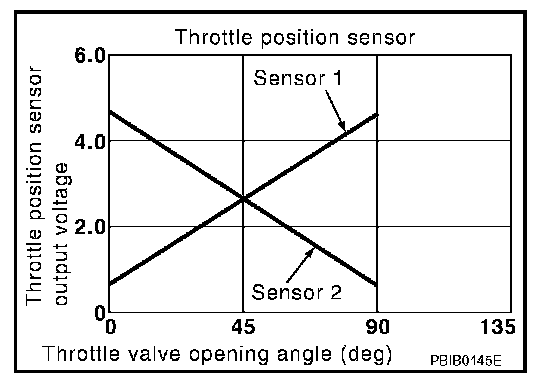 The throttle position sensor has the two sensors. These sensors are a kind of potentiometers which transform the throttle valve position into output voltage, and emit the voltage signal to the ECM. In addition, these sensors detect the opening and closing speed of the throttle valve and feed the voltage signals to the ECM. The ECM judges the current opening angle of the throttle valve from these signals and the ECM controls the throttle control motor to make the throttle valve opening angle properly in response to driving condition.
