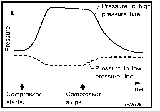 Refrigerant leaks should be checked immediately after stopping the engine. Begin with the leak detector at the compressor. The pressure on the high pressure side will gradually drop after refrigerant circulation stops and pressure on the low pressure side will gradually rise, as shown in the graph. Some leaks are more easily detected when pressure is high.