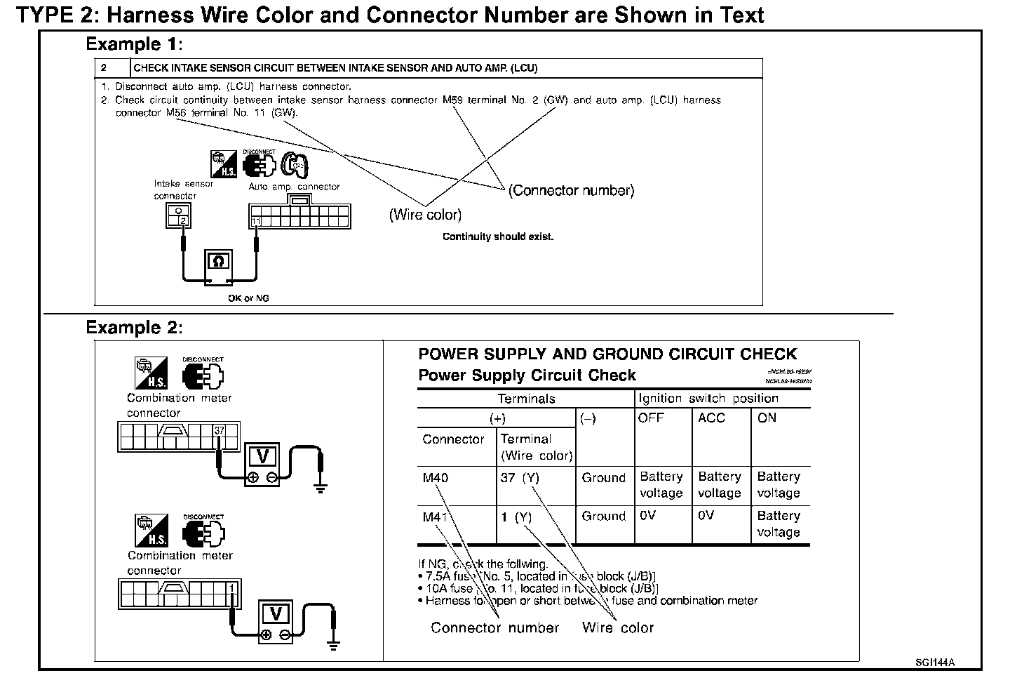 TYPE 2: Harness Wire Color and Connector Number are Shown in Text