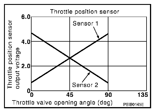 The throttle position sensor has the two sensors. These sensors are a kind of potentiometers which transform the throttle valve position into output voltage, and emit the voltage signal to the ECM. In addition, these sensors detect the opening and closing speed of the throttle valve and feed the voltage signals to the ECM. The ECM judges the current opening angle of the throttle valve from these signals and the ECM controls the throttle control motor to make the throttle valve opening angle properly in response to driving condition.