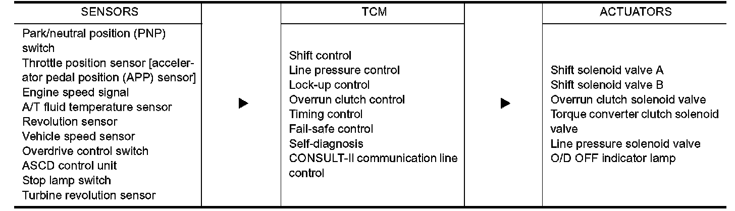 The automatic transaxle senses vehicle operating conditions through various sensors. It always controls the optimum shift position and reduces shifting and lock-up shocks.