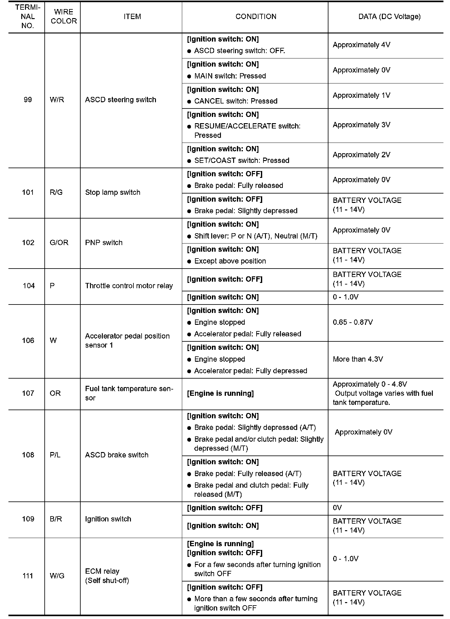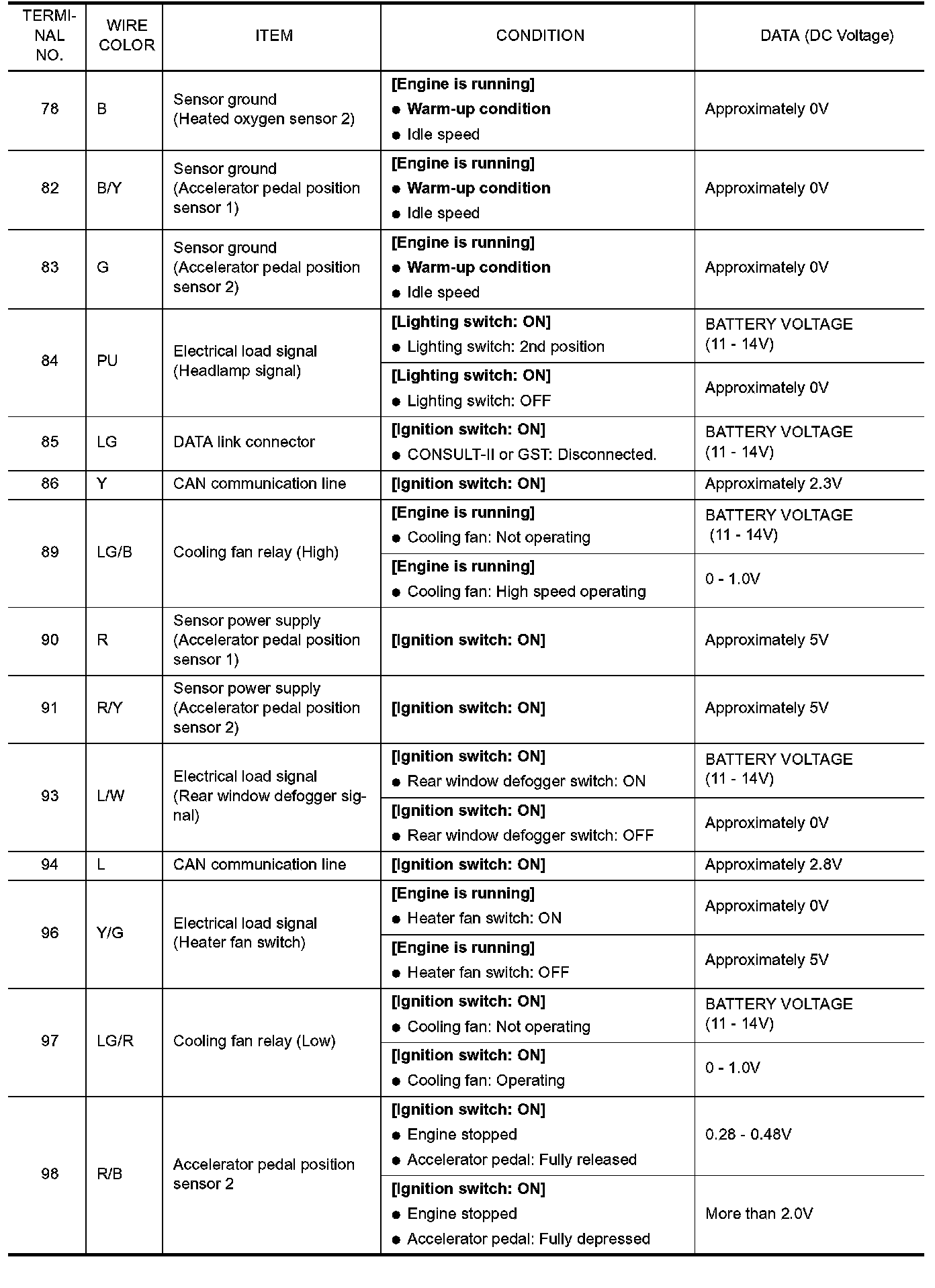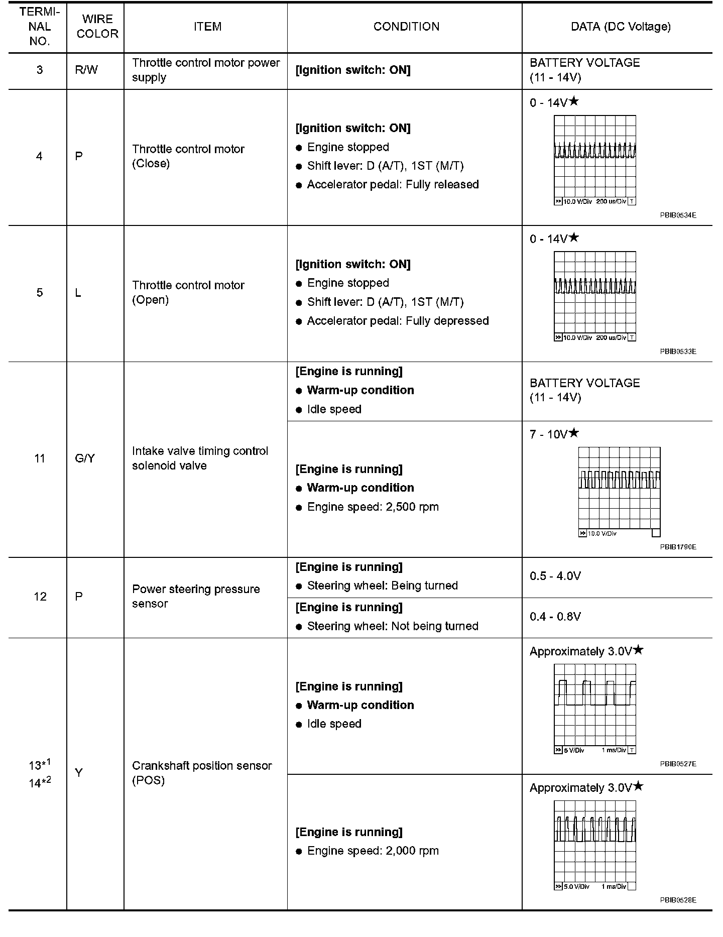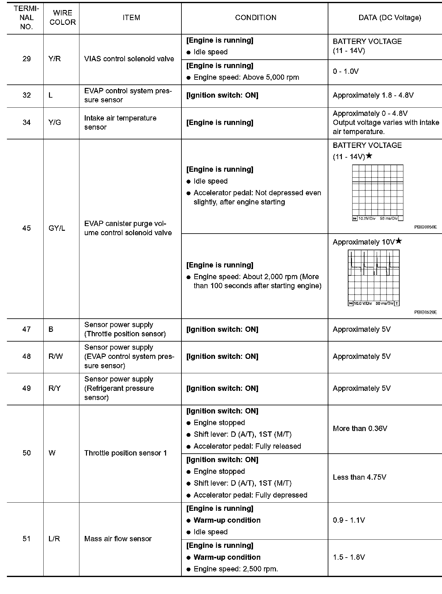 Specification data are reference values and are measured between each terminal and ground. Pulse signal is measured by CONSULT-II.
