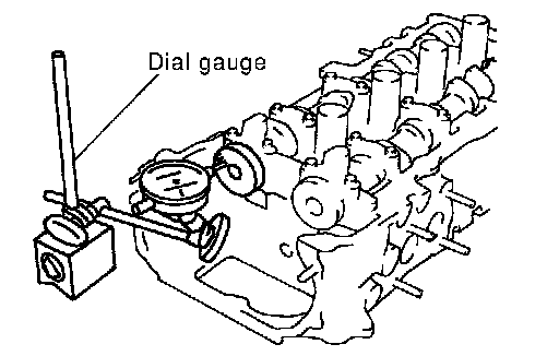 1. Install a dial gauge in the thrust direction on the front end of the camshaft. Measure the end play with the dial gauge while moving the camshaft forward and backward (in direction to axis).