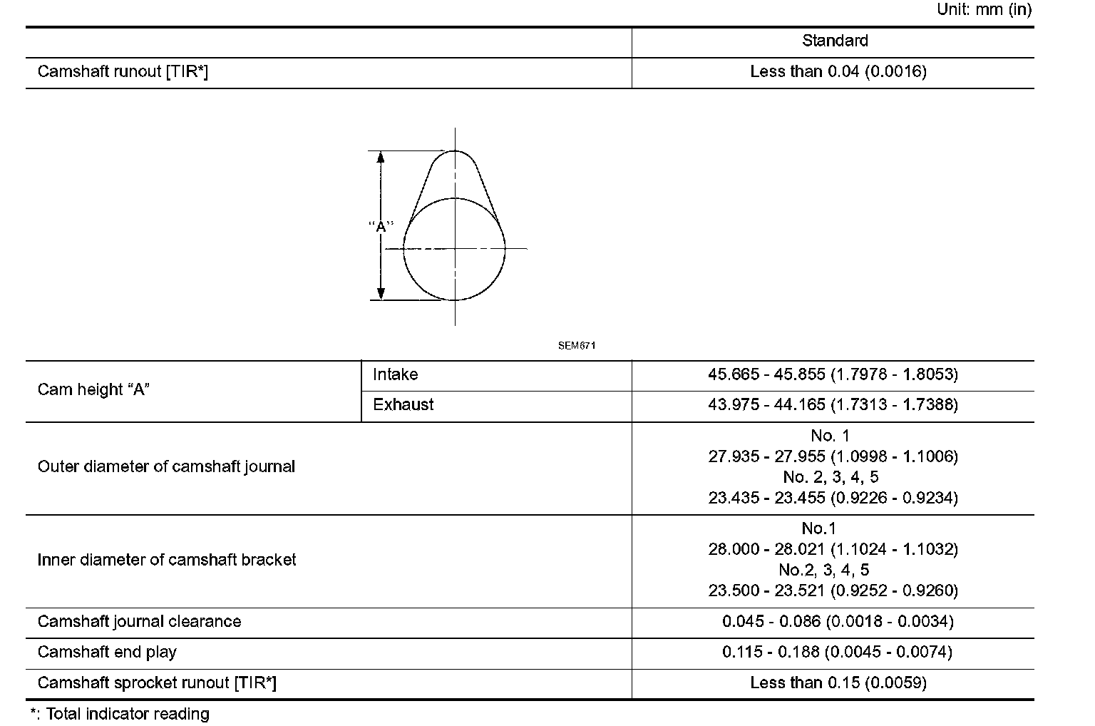 Standard intake cam height: 45.665 - 45.855 mm (1.7978 - 1.8053 inch)
