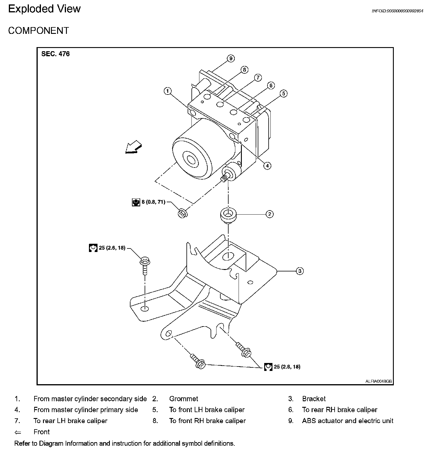 ^ To remove brake tube, use a flare nut wrench to prevent flare nuts and brake tube from being damaged. To install, use flare nut torque wrench.