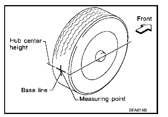 3. Put a mark on base line of the tread (rear side) of both tires at the same height of hub center. This mark is a measuring point.