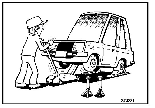 - Before jacking up the vehicle, apply wheel chocks or other tire blocks to the wheels to prevent the vehicle from moving. After jacking up the vehicle, support the vehicle weight with safety stands at the points designated for proper lifting before working on the vehicle.