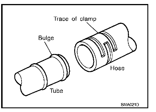 - If old rubber hose is re-used, install hose clamp in its original position (at the indentation where the old clamp was). If there is a trace of tube bulging left on the old rubber hose, align rubber hose at that position.
