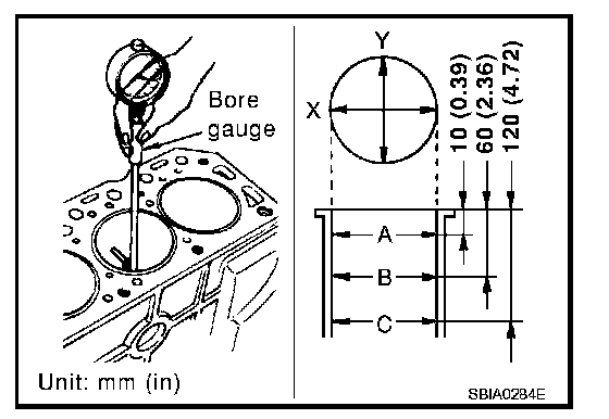 ^ Using a bore gauge, measure cylinder bore for wear, out-of-round and taper at 6 different points on each cylinder. (X and Y directions at A, B and C). The Y axis is in the longitudinal direction of the engine.