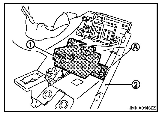 3. Remove the key slot mounting screw (A), and then remove key slot (1) from instrument lower panel LH (2).