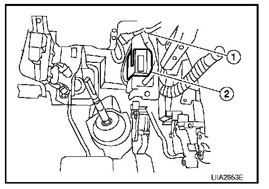 2. Disconnect Intelligent Key unit connector, remove the nut and the Remote keyless Entry (RKE) receiver (2).