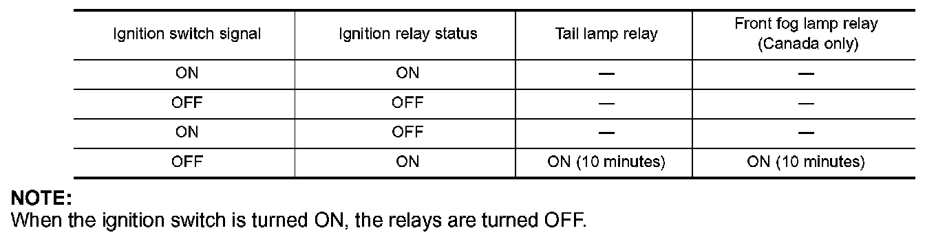 - When the state of the integrated ignition relay does not agree with the state of the ignition switch signal received via CAN communication, the IPDM E/R activates the tail lamp relay and front fog lamp relay (Canada only).