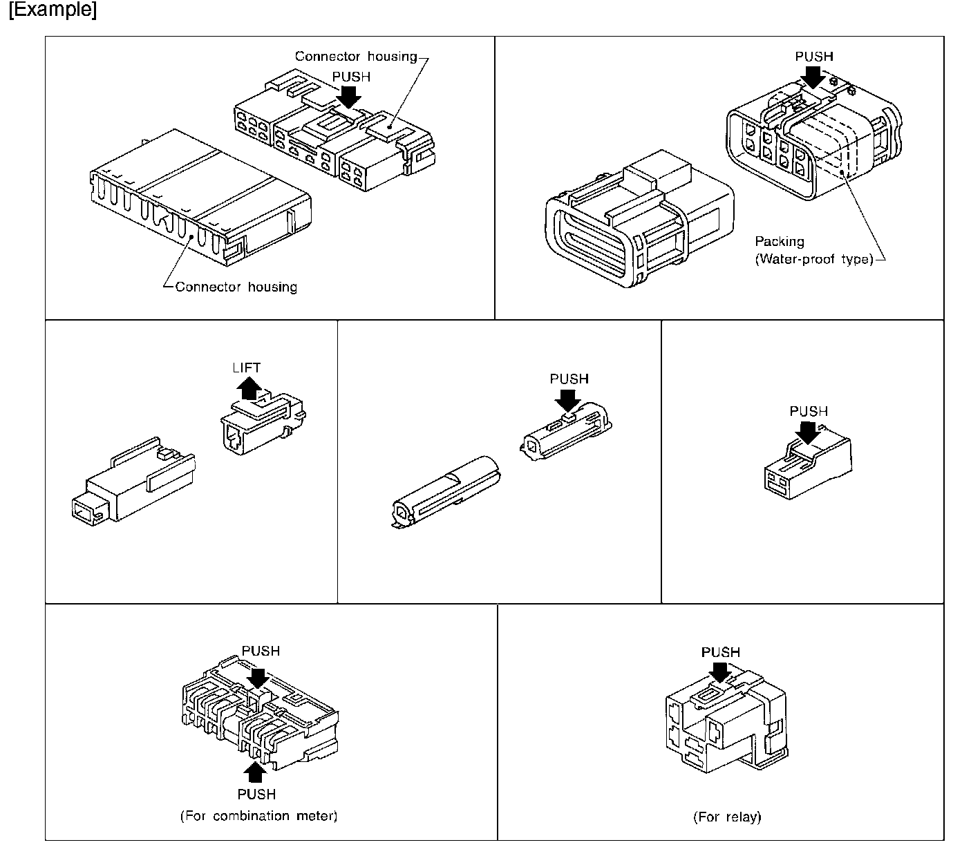 - The tab-locking type connectors are disconnected by pushing or lifting the locking tab(s). Refer to the illustration.