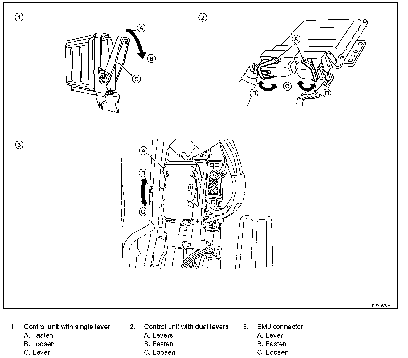 - Lever locking type harness connectors are used on certain control units and control modules such as ECM, ABS actuator and electric unit (control unit), etc.