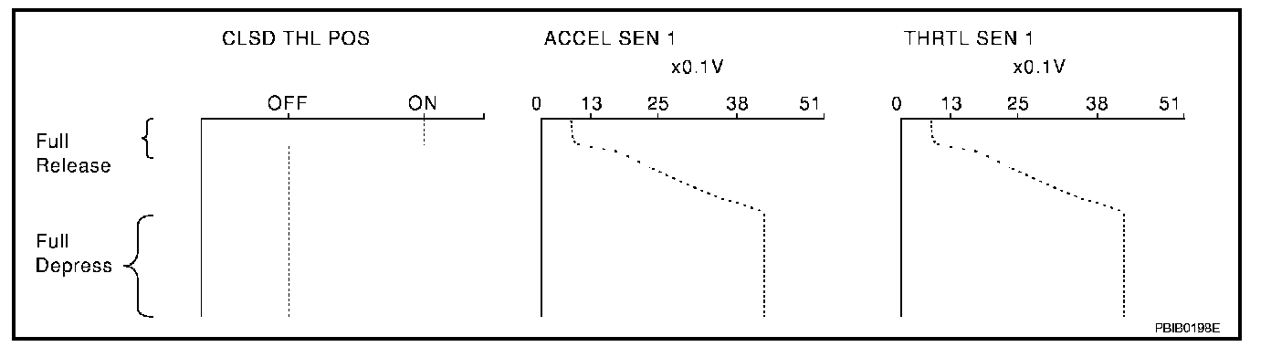 Above is the data for "CLSD THL POS", "ACCEL SEN 1" and "THRTL SEN 1" when depressing the accelerator pedal with the ignition switch ON and with shift lever in D position.
